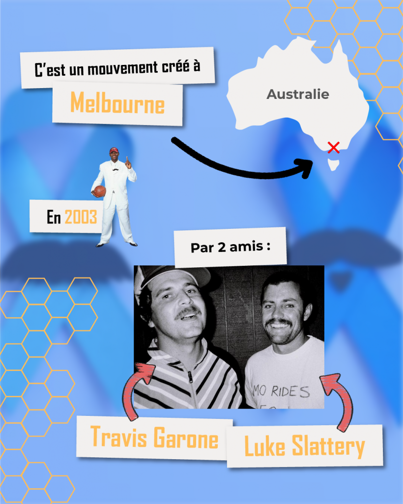🌍 Movember est né à Melbourne, au sud de l’Australie, en 2003. Le mouvement apparaît suite à l’initiative de 2 amis : Travis Garone et Luke Slattery.